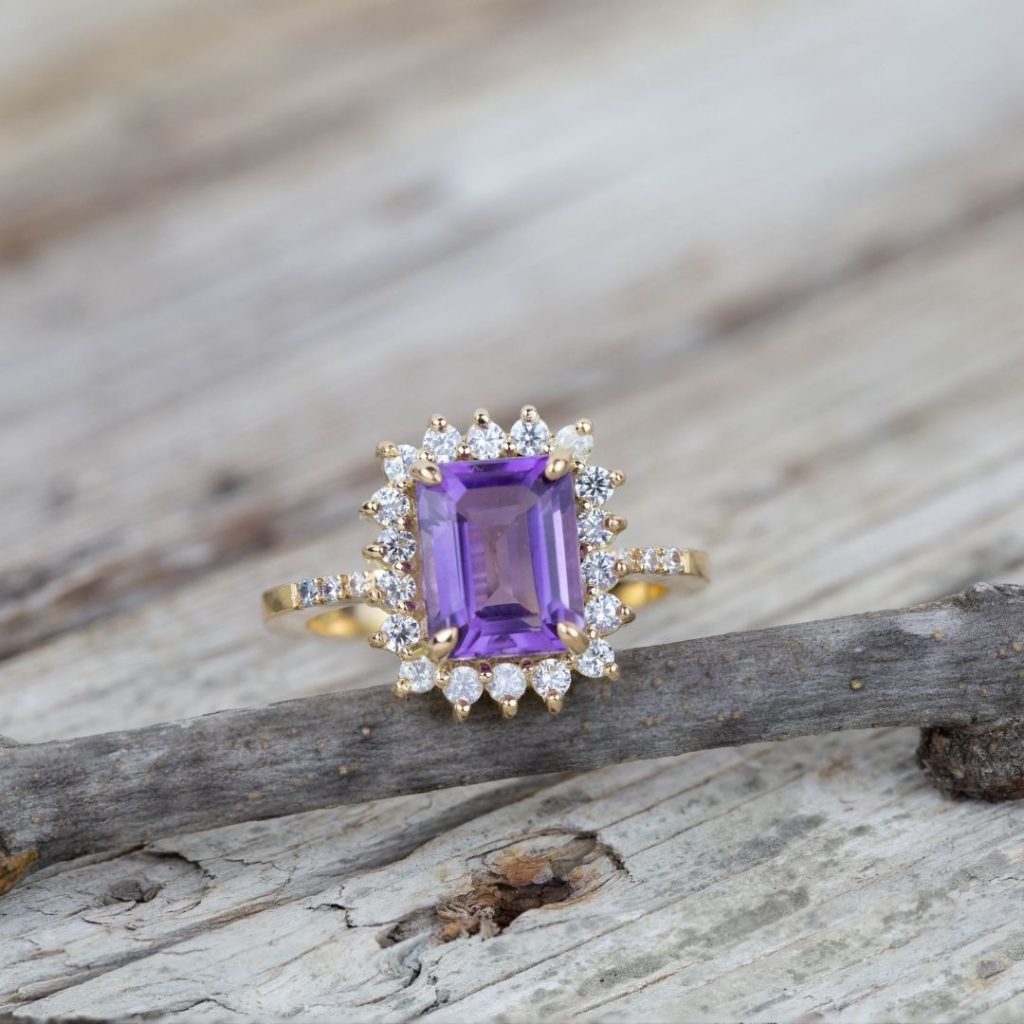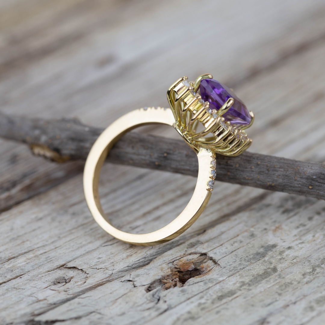 En el centro lleva una Amatista Natural talla Esmeralda rodeada de un halo de diamantes.